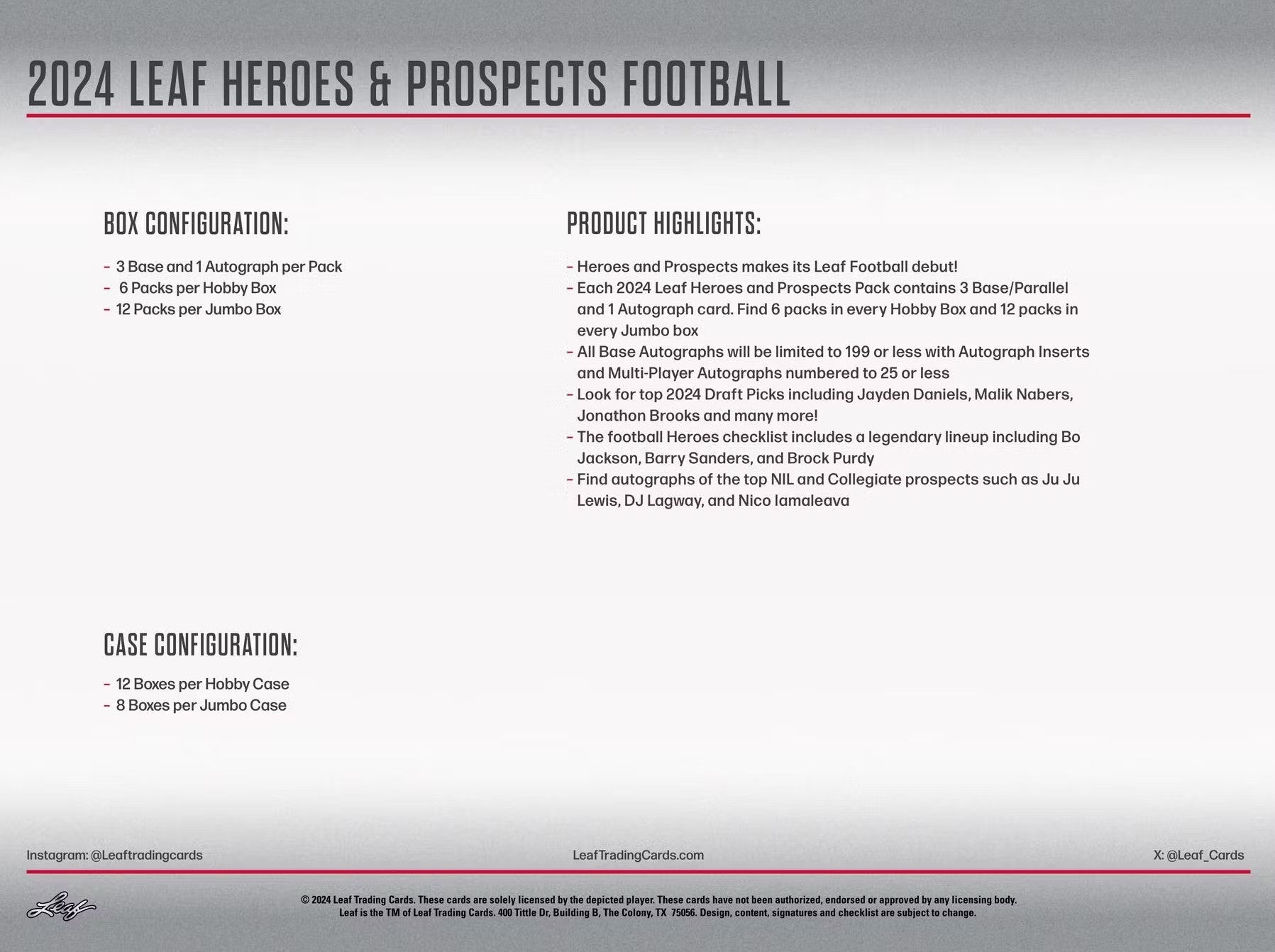 2024 Leaf Heroes and Prospects Football Hobby Trading Cards