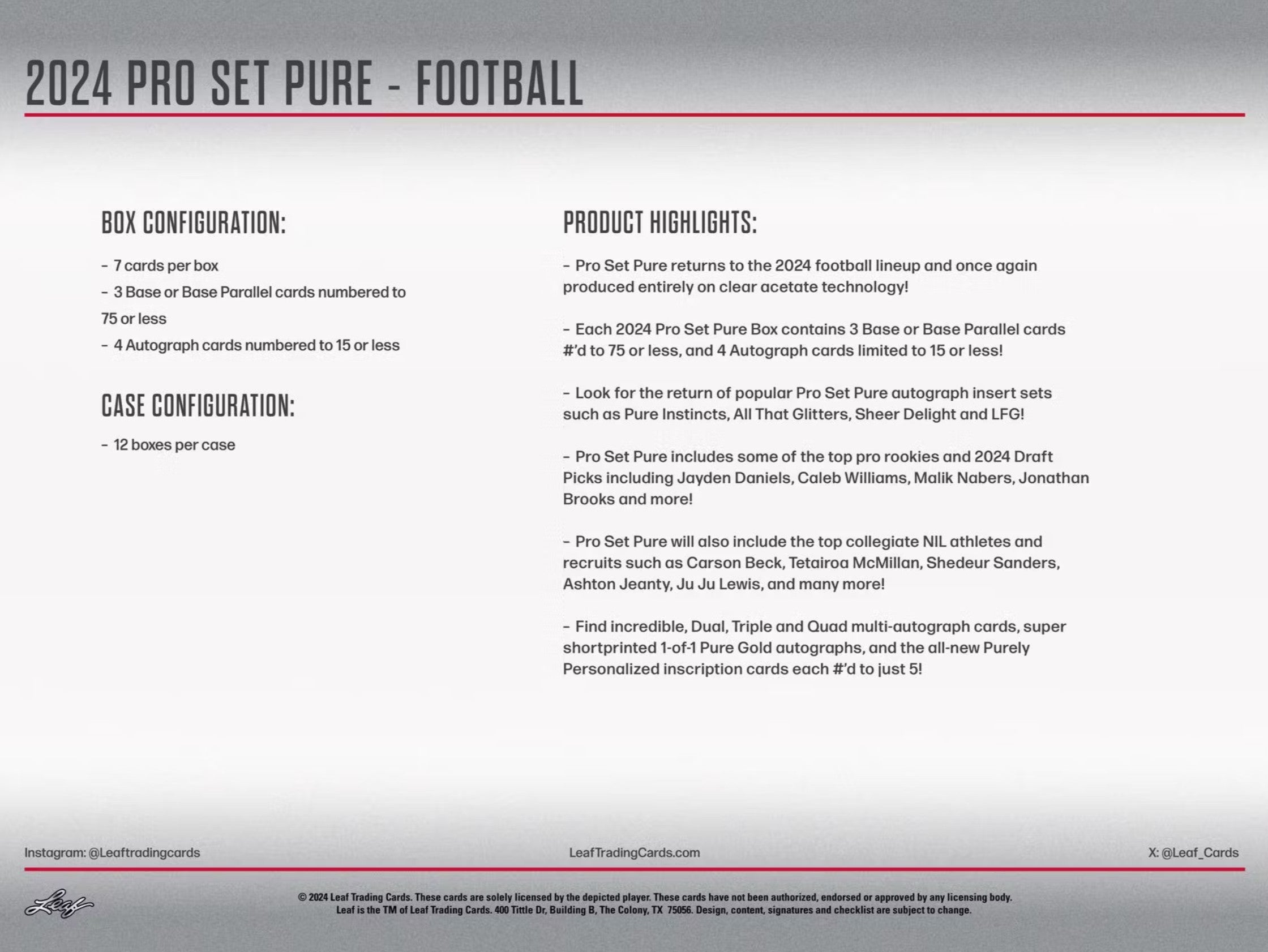 2024 Leaf Pro Set Pure Football Hobby Trading Cards